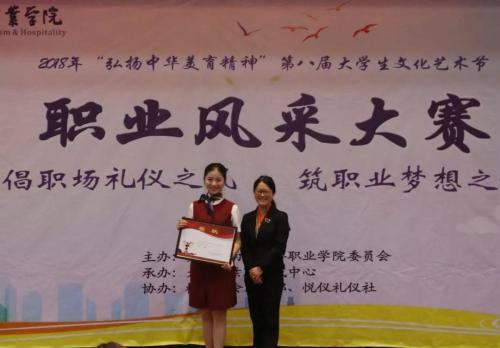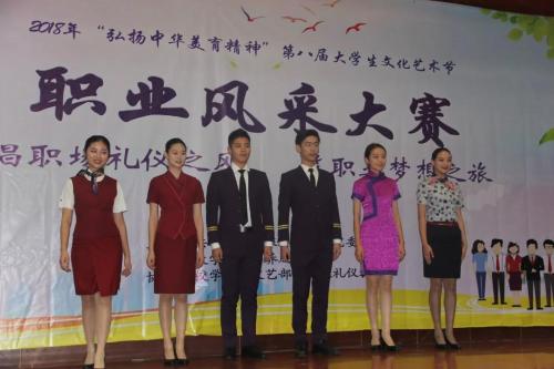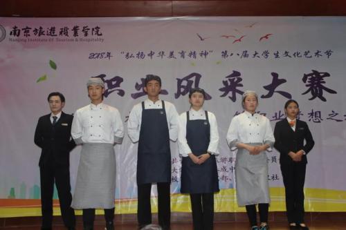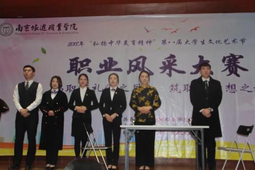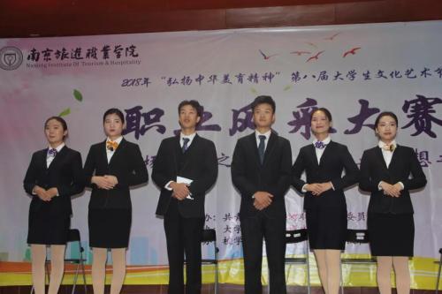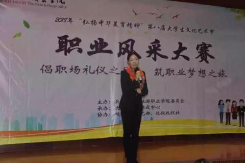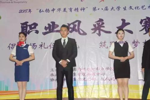 为了宣传职业风采,充分的让学生了解职业的风采,弘扬中华美育精神,让同学们更好遵循礼仪规范,树立文明新风,是未来职业的基本要求,是时代的呼唤,筑职业梦想之旅。2018年“弘扬中华美育精神”第八届大学生文化艺术节职业风采大赛于2018年11月21日下午2:00正式在图书馆报告厅举行,本次大赛的评委由酒店管理学院管晨蓉老师,旅游管理学院陈菊霞老师,烹饪与营养学院王雨老师,人文艺术系陈璐老师,国际旅游系徐嫚老师担任。出席本次活动的嘉宾有校团委书记兼学工处处长李艳,团委副书记鲁晨阳,校团委沙成金老师,学工处吴丹老师,人文艺术系戚薇老师。