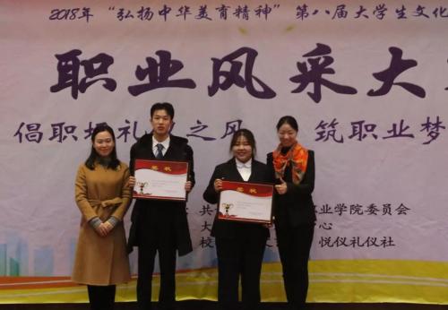 两位主持人以自信,优美的形象走向舞台,用最美的声音向大家介绍2018年“弘扬中华美育精神”第八届大学生文化艺术节职业风采大赛的正式开始。