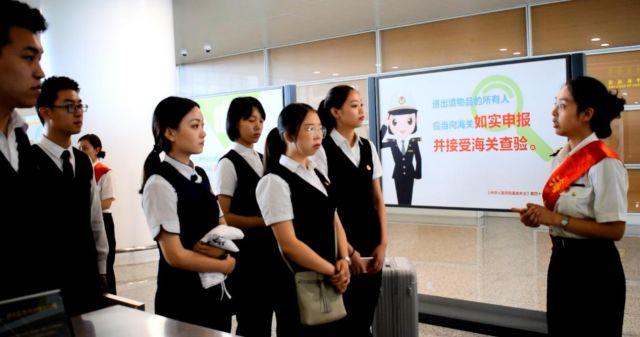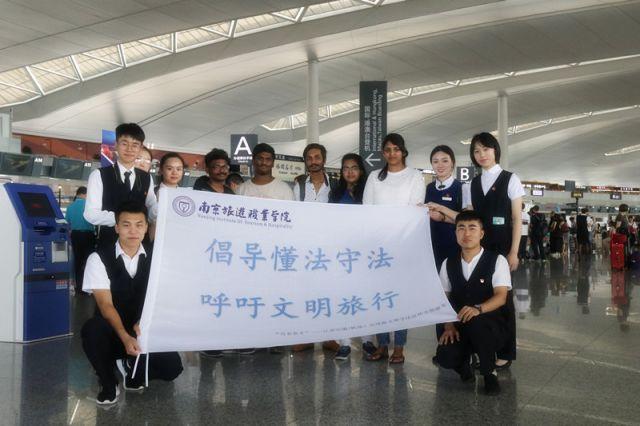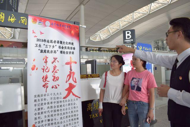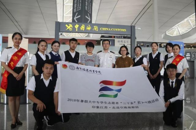 7月3日下午,校团委副书记鲁晨阳、校团委老师沙成金作为我校两支暑期社会实践团队带队老师与9名学生赴南京禄口机场进行暑期社会实践活动。本次暑期社会实践活动得到了金陵海关驻禄口机场办事处的大力支持,金陵海关团委书记邹海洋,金陵海关驻禄口机场办事处团支部书记周帆以及海关关员杨晟卉接待了我校团队。团队成员对机场的游客进行了文明出境旅游宣讲及调研,与海关出入境关员进行了访谈、交流与学习。 交流现场,金陵海关驻禄口机场办事处团支部书记周帆作为海关志愿者带领社会实践团队进入禄口国际机场海关出境现场参观并讲解了文明守法出入境的相关的知识。重点向大家介绍了有关出境所要了解的相关法律法规,违禁物品等知识。
