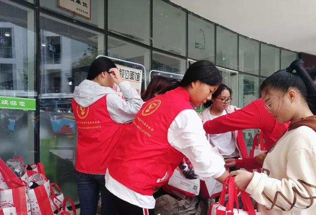 (志愿者为献血同学发放小礼品)