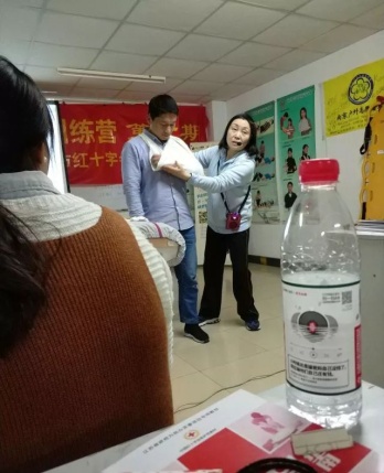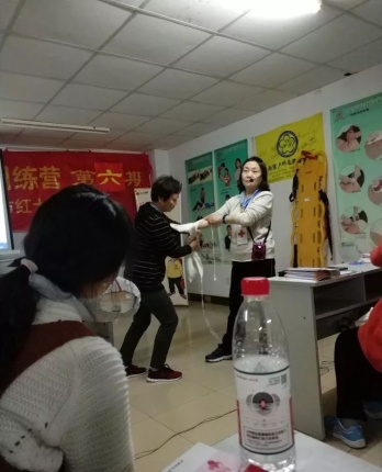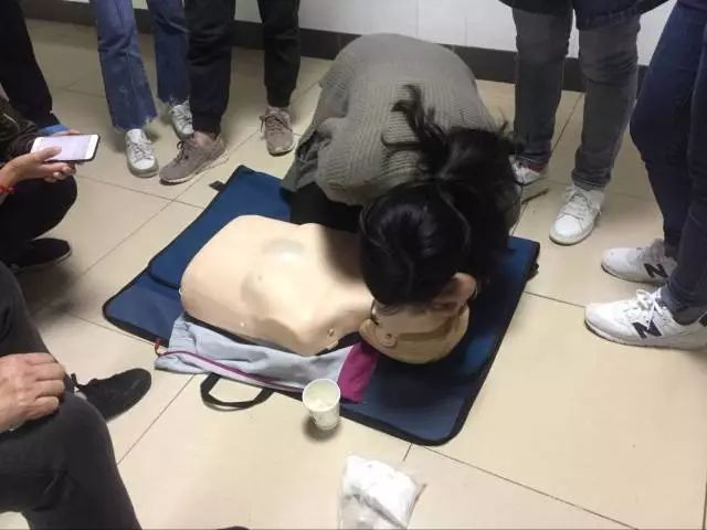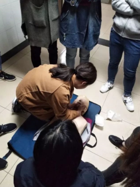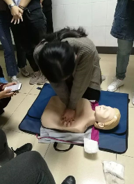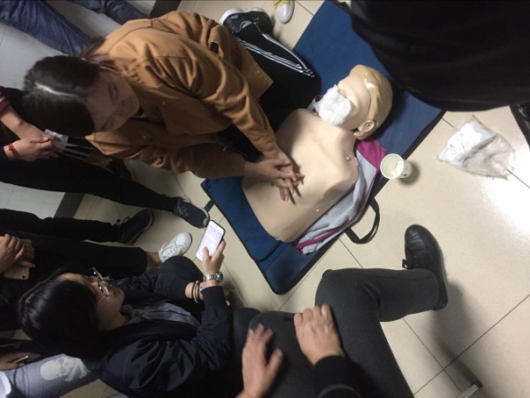 在这次培训中同学们不仅学会了对较小的伤口进行处理和包扎,还学会了对丧失意识、没有呼吸的病人进行人工呼吸和胸外按压以及自动除颤仪的使用。值得一说的是,除了学生还有几名中年妇女和十几位安保人员,让同学们不禁感叹学会这样的知识是多么的重要且不分年龄和职业。