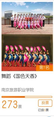 3. 找到“舞蹈《国色天香》南京旅游职业学院”。最后点击投票,你就成功的为自己学校的选手成功的投了一票!