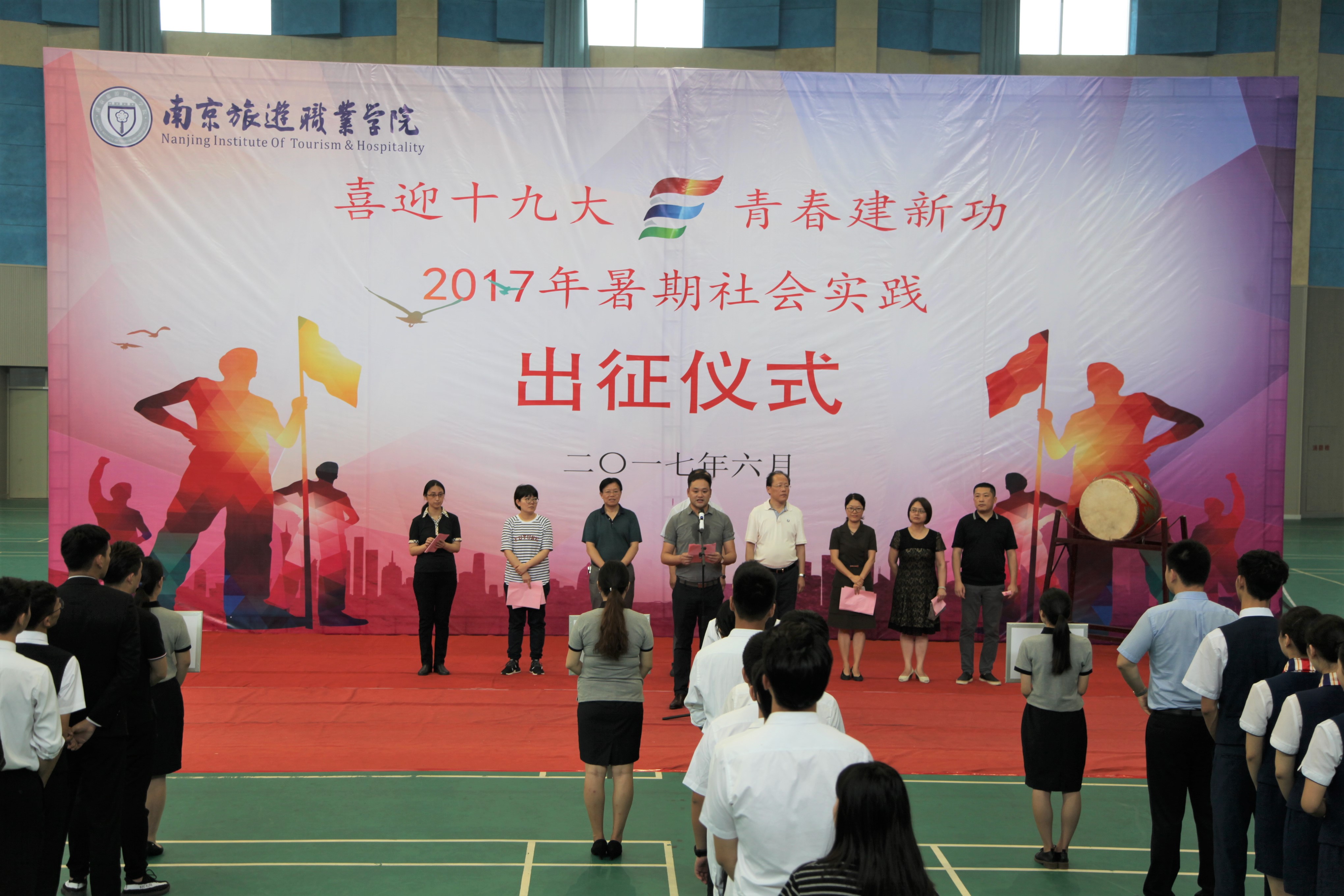 2017年6月30日上午9:00,南京旅游职业学院2017年暑假社会实践出征仪式在体育馆内如期举行。校党委书记王海平,副书记黄斌,学生工作处处长李艳,各二级院(系)党支部负责人,团总支书记,辅导员以及各实践团队指导老师、学生参加了出征仪式。本次出征仪式由学生工作处陈勇主持。