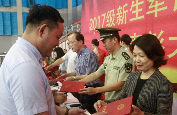冯明副校长宣读《南京旅游职业学院关于表彰2017级新生军训“先进集体”和“先进个人”的决定》,学校和部队领导分别为获奖人员颁奖。