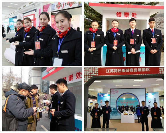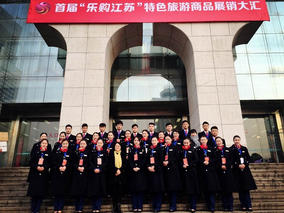 1月15至18日,由江苏省旅游局主办的首届“乐购江苏”特色旅游商品展销大汇在南京市规划建设展览馆成功举办。我校人文艺术系空乘专业30名学生在党总支副书记狄苏的带领下,参加了特色旅游商品展销大汇的志愿者服务,获得社会各界一致好评。