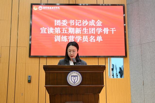 沙成金宣读第五期团学骨干训练营学员名单,她希望参加本次训练营的学员们,以积极的态度和饱满的热情迎接新学期、新挑战,学有所获、学有所成。