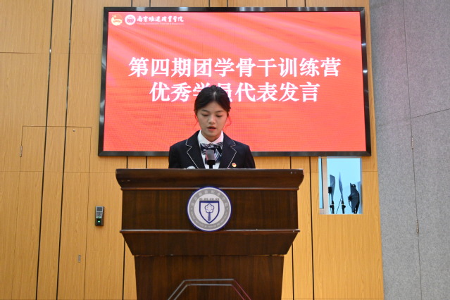 第四期新生团学骨干训练营优秀学员代表陈美玲发言。她号召新一期的学员们务必要认真参加训练营的系列培训和学习,真正承担起争做社会主义接班人的担当与责任。
