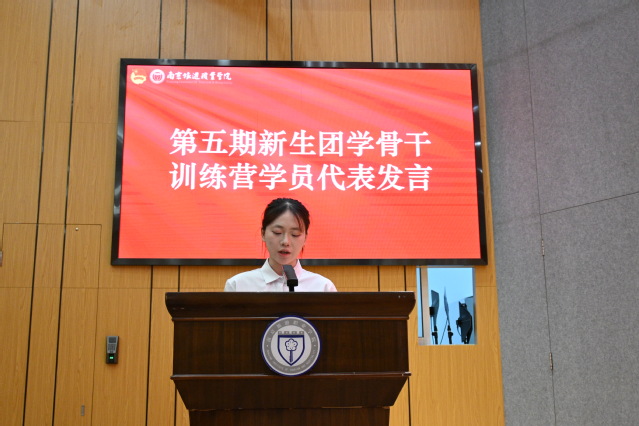 第五期新生团学骨干训练营学员代表袁媛发言。她表示一定会积极配合训练营开展的系列培训,用行动为新时代贡献青春力量。