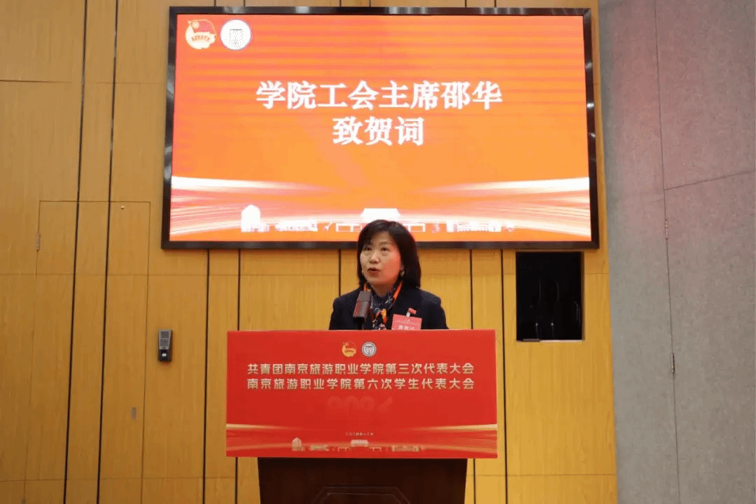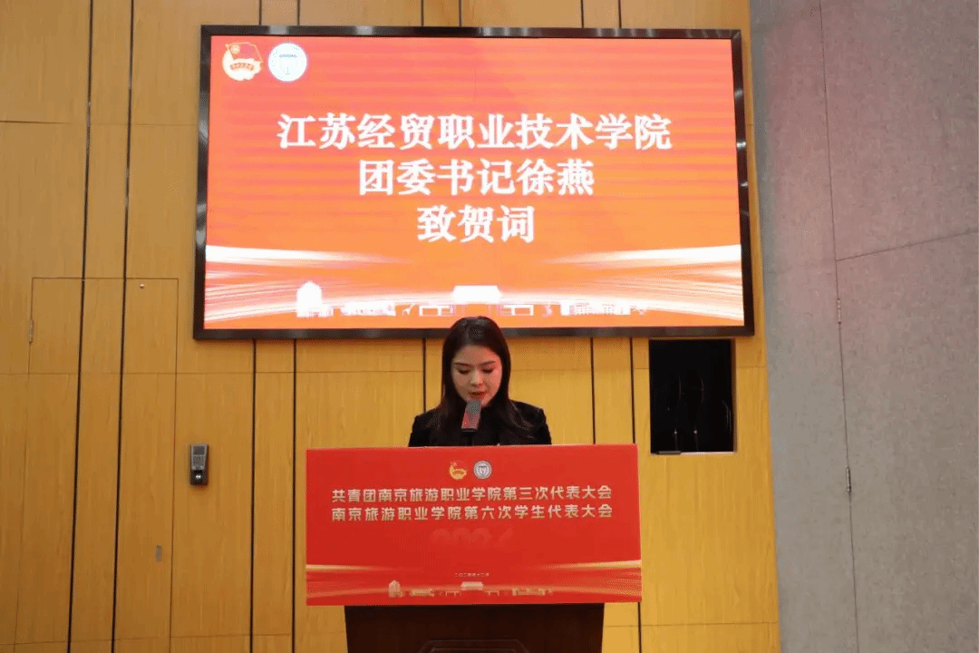 江苏经贸职业技术学院团委书记徐燕代表兄弟院校致辞,学院工会主席邵华代表群团组织致辞,分别向大会的胜利召开表示热烈祝贺。