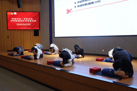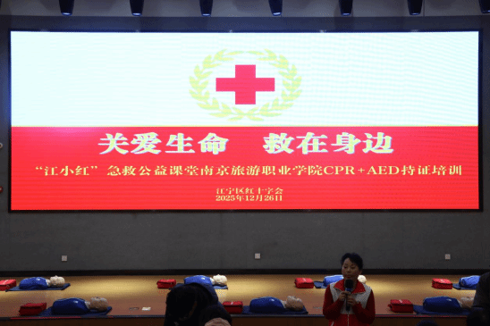 为全面提升大学生的安全防范意识,广泛传播应急救护常识,增强自救互救及应急处置能力,12月26日,我院团委携手南京市江宁区红十字会救护培训中心,成功举办了以“赋能师生 守护生命”为主题的2025南京旅游职业学院校园救护员培育活动。参与本次活动的成员包括党总支副书记、辅导员、体育老师、物业管理人员以及“团学”“青马”的学生代表,他们齐心协力,共同完成了心肺复苏(CPR)与自动体外除颤器(AED)救护员资格的培训课程。