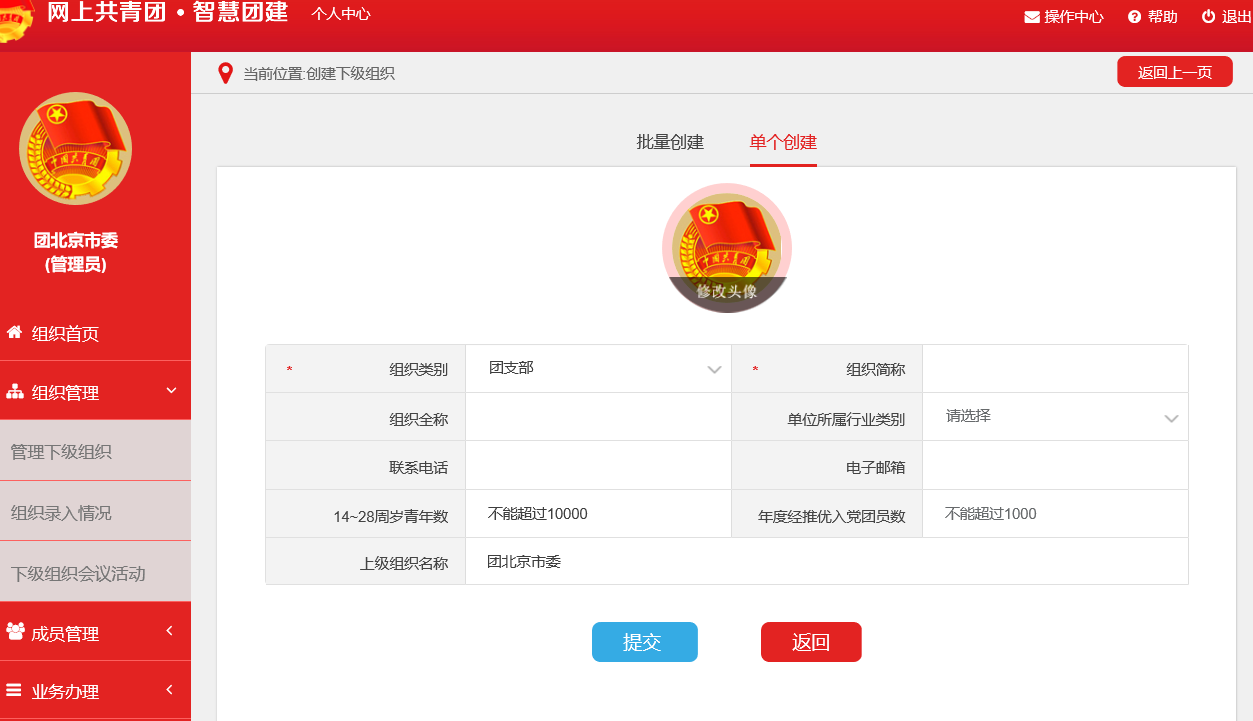 (3)点击“单个创建”按钮,进入单个创建下级组织页面。