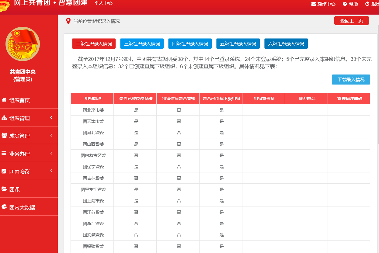 2017年12月11日—15日:第二级组织(团省委)信息录入。12月13日前,团省委完成本级组织信息录入和直属下级组织创建。12月15日前,分配第三级组织管理员注册码。
