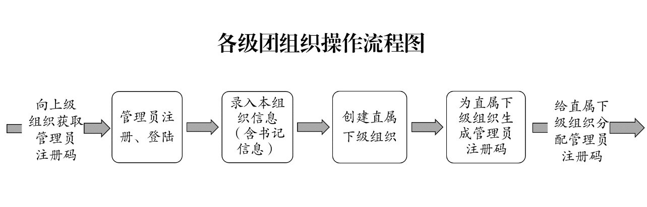 2.任务。每个团组织须完成以下任务(团支部只须完成第一、二项):一要指定一名管理员用上级团组织分配的管理员注册码登陆系统;二要按系统要求录入本组织和书记的基本信息;三要完整创建直属下级团组织;四要为直属团组织生成管理员注册码,并将管理员注册码分配至各直属团组织;五要推动逐级建立下级团组织,并录入组织信息。