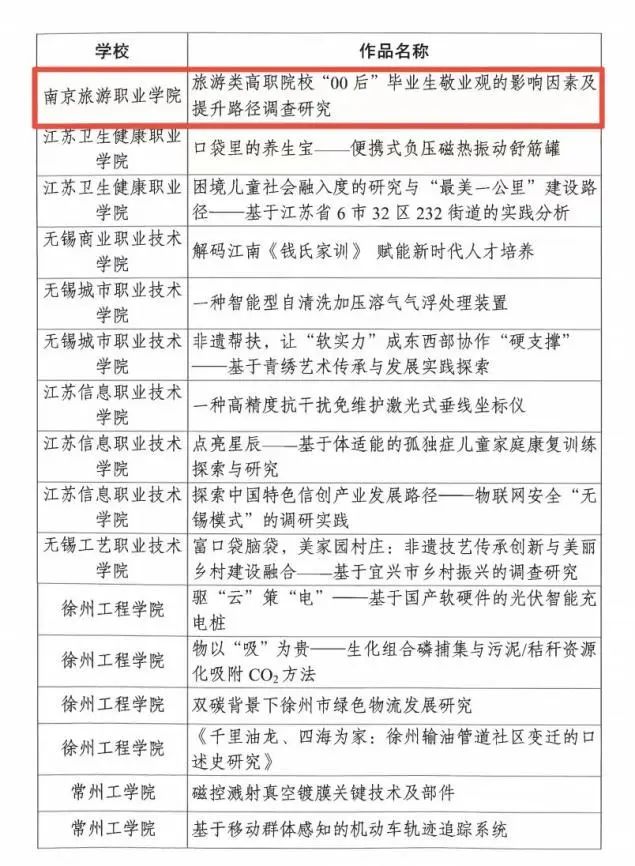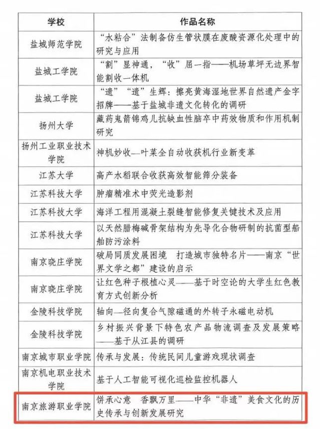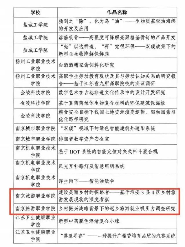 经组织申报、省级团委评审推荐,南京旅游职业学院《饼承心意 香飘万里——中华“非遗”美食文化的历史传承与创新发展研究》和《旅游类高职院校“00后”毕业生敬业观的影响因素及提升路径调查研究》获评第十八届“挑战杯”全国大学生课外学术科技作品竞赛江苏省选拔赛二等奖。《建设美丽乡村的探路者——基于淮安3县4区乡村旅游发展现状的深度考察》和《乡村振兴战略背景下的返乡旅游就业吸引力调查研究》获评第十八届“挑战杯”全国大学生课外学术科技作品竞赛江苏省选拔赛三等奖。