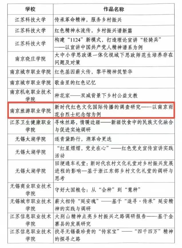 经组织申报、省级团委评审推荐,南京旅游职业学院《关于南京市红色旅游资源教育功能及影响力的调查研究》获评第十八届“挑战杯”全国大学生课外学术科技作品竞赛“红色专项”活动江苏省选拔赛二等奖,《新时代红色文化国际传播的调查研究--以南京雨花台烈士纪念馆为例》获评第十八届“挑战杯”全国大学生课外学术科技作品竞赛“红色专项”活动江苏省选拔赛三等奖。