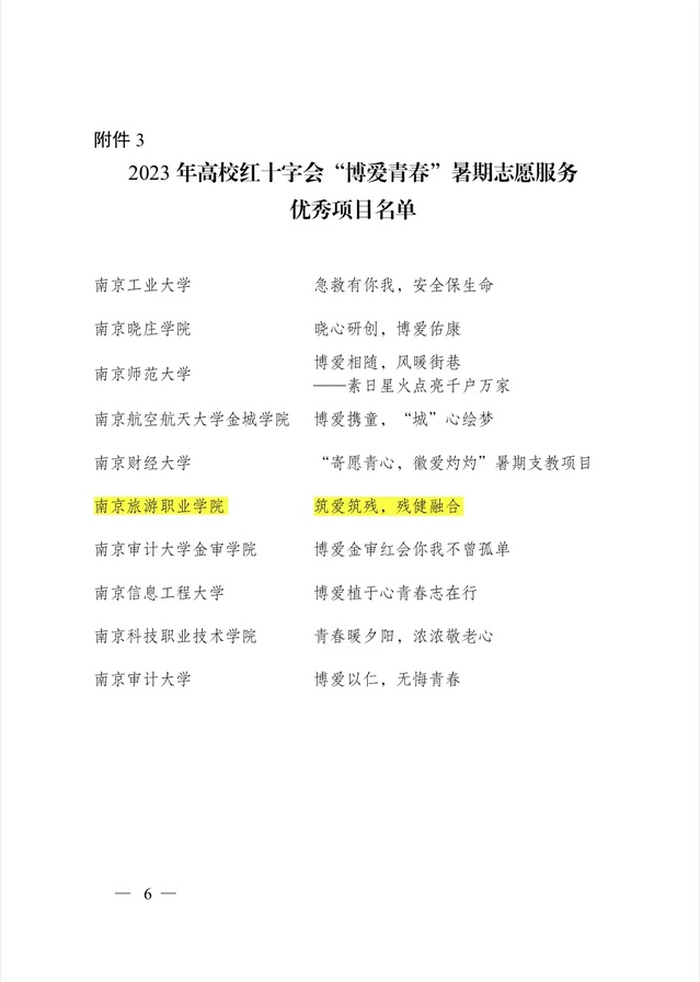 近日,南京市红十字会通报了2023年度南京市高校红十字会“博爱青春”暑期志愿服务项目实施情况,由我校红十字会推报的“筑爱筑残,残健融合”项目在2023年高校红十字会“博爱青春”暑期志愿服务评选中获市级支持项目;该项目在20个项目中脱颖而出,获评2023年高校红十字会“博爱青春”暑期志愿服务优秀项目;吴云老师荣获优秀指导老师;杨辰等3名同学荣获优秀大学生志愿者。
