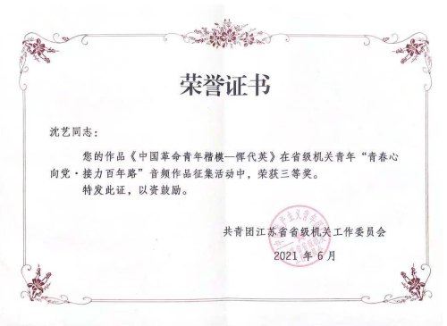 为深入学习贯彻习近平总书记在党史学习教育动员大会上的重要讲话精神,扎实推进党史学习教育工作,团委积极组织青年学生参加各项学习活动,锤炼政治品性,提升政治素养。近日,在省级机关团工委联合省广电总台团委开展的省级机关青年“青春心向党·接力百年路”音频作品征集活动,我院沈艺同学荣获三等奖。