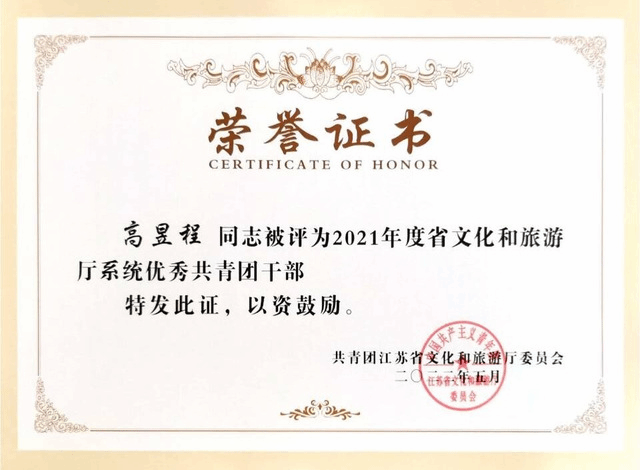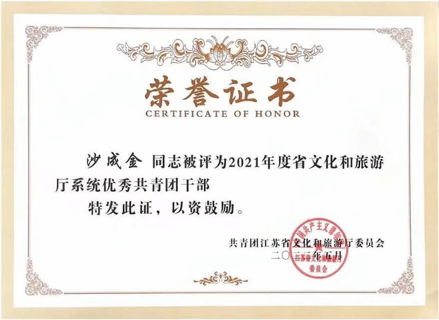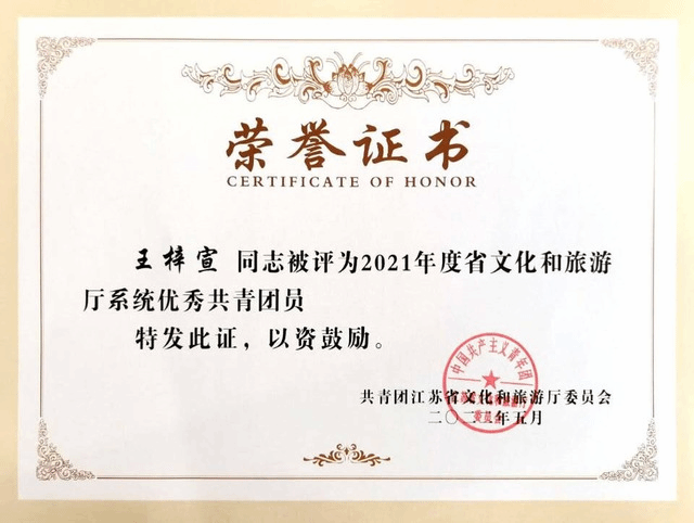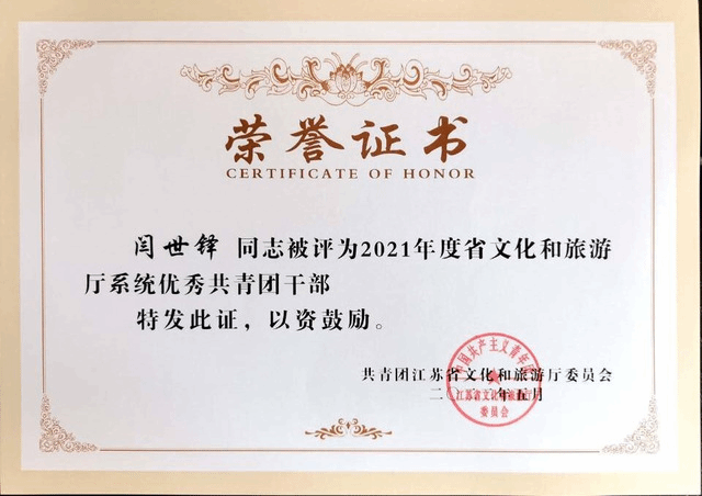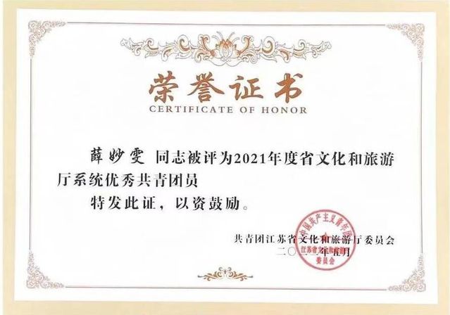 部分获“省文化和旅游厅系统优秀共青团员”奖状