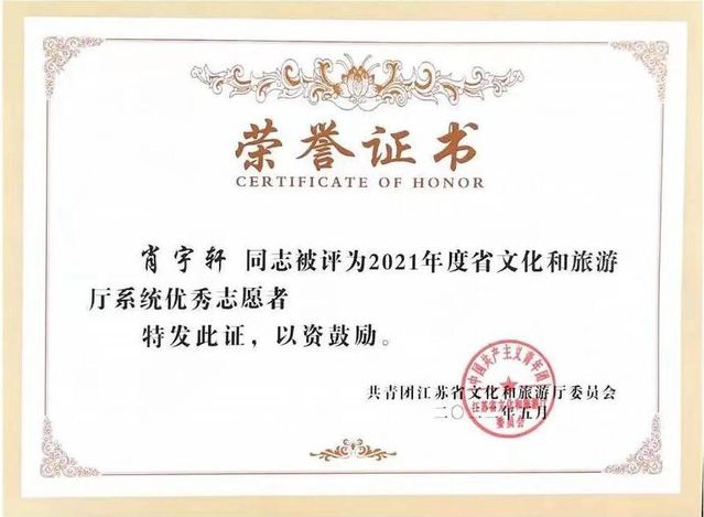 部分获“省文化和旅游厅系统优秀志愿者”奖状