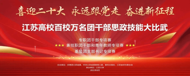 8月28日至31日,由共青团江苏省委、中共江苏省委教育工委等单位联合主办的“喜迎二十大、永远跟党走、奋进新征程”江苏高校百校万名团干部思政技能大比武决赛在江苏大学举行。