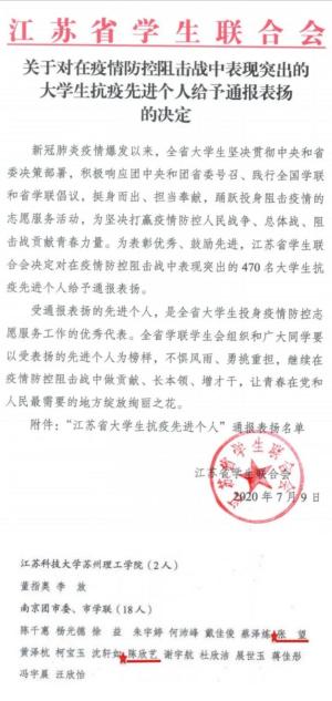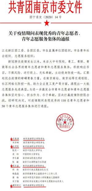 新冠肺炎疫情发生以来,我院学生积极响应号召,不惧风险、逆行而上、无私奉献,主动投身防疫一线,汇聚起抗击疫情的磅礴青春力量。近期,在江苏省学生联合会发布的《关于对在疫情防控阻击战中表现突出的大学生抗疫先进个人给予通报表扬的决定》中,张望、陈欣艺2名同学被表彰为“江苏省大学生抗疫先进个人”;在《关于疫情期间表现优秀的青年志愿者、青年志愿服务集体的通报》中,沈振源、祝乐益、余河悦、濮阳雨文4名同学被授予“南京市优秀防疫青年志愿者”荣誉称号。