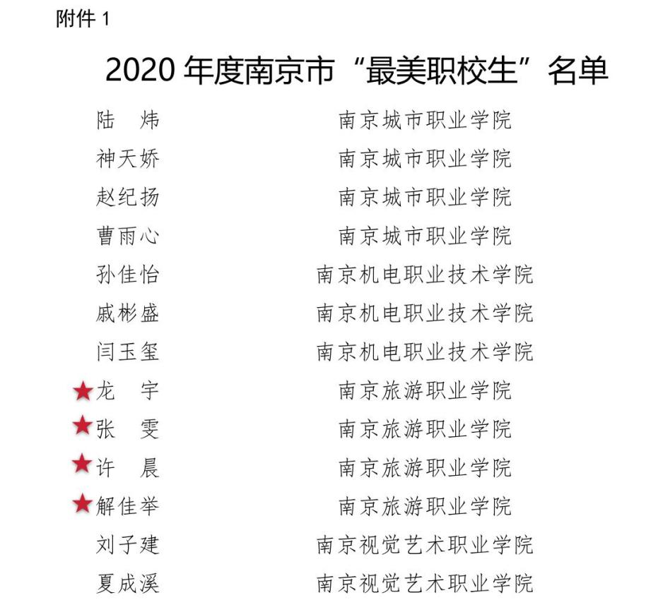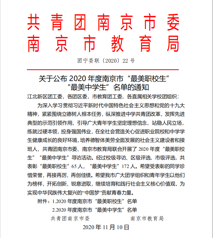 为深入学习贯彻习近平新时代中国特色社会主义思想和党的十九大精神,紧紧围绕立德树人根本任务,纵深推进共青团工作改革,引导广大青年学生坚定理想信念,站稳人民立场,练就过硬本领,投身强国伟业。经二级学院申报、团委推荐、团市委评选,最终我院共有龙宇等4名学生获得2020年度南京市“最美职校生”称号,突破去年首次获得该奖项的人数。