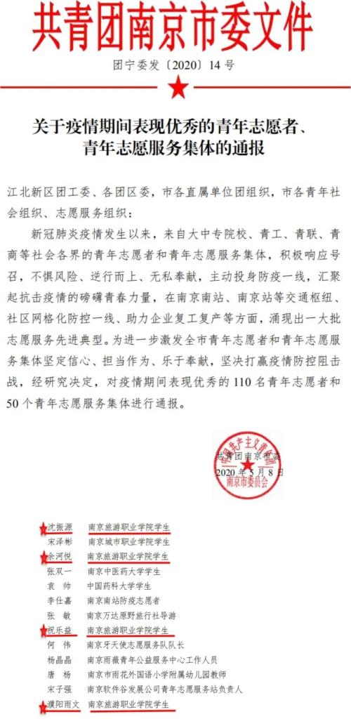 新冠肺炎疫情发生以来,我院学生积极响应号召,不惧风险、逆行而上、无私奉献,主动投身防疫一线,汇聚起抗击疫情的磅礴青春力量。近期,在江苏省学生联合会发布的《关于对在疫情防控阻击战中表现突出的大学生抗疫先进个人给予通报表扬的决定》中,张望、陈欣艺2名同学被表彰为“江苏省大学生抗疫先进个人”;在《关于疫情期间表现优秀的青年志愿者、青年志愿服务集体的通报》中,沈振源、祝乐益、余河悦、濮阳雨文4名同学被授予“南京市优秀防疫青年志愿者”荣誉称号。