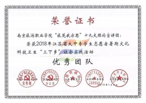 近日,在江苏省党委宣传部、省文明办、省教育厅、团省委、省学生联合会联合组织开展的2018年江苏省大中专学生志愿者暑期“三下乡”社会实践活动优秀团队评选中,我校首次获得省级表彰。校团委“旅苑我亦思”团队获江苏省暑期“三下乡”社会实践活动优秀团队、1名指导老师荣获“优秀工作者”荣誉称号。