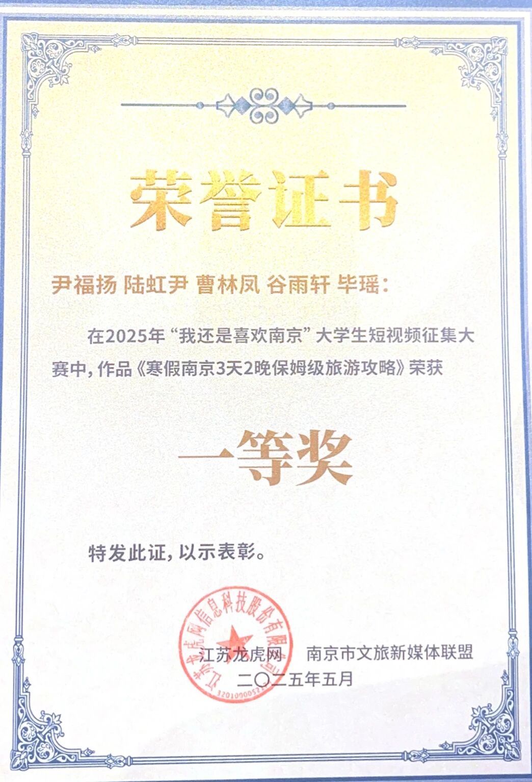 在活动配套的“我还是喜欢南京”大学生短视频征集大赛中,我院荣获“优秀组织奖”。旅游管理学院尹福扬、陆虹尹、曹林凤、谷雨轩、毕瑶五位同学在顾至欣、李俊楼、宋立三位教师的精心指导下,凭借出色作品斩获大赛“一等奖”。