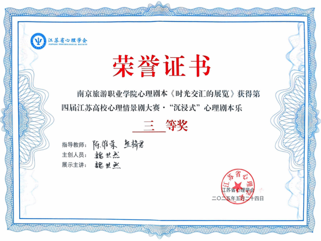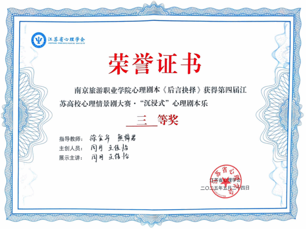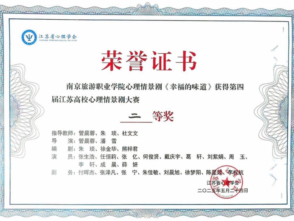 近日,由江苏省心理学会艺术心理辅导与治疗专业委员会、心理学教学工作委员会、大学生心理专业委员会等共同承办的第四届江苏高校心理情景剧大赛落下帷幕。我院选送作品在激烈竞争中脱颖而出,共斩获五项大奖:《解忧锦囊铺》心理微剧场荣获一等奖,《幸福的味道》荣获心理情景剧赛道二等奖和最佳剧本奖;原创剧本《时光交汇的展览》和《后言抉择》分获“沉浸式”心理剧本乐赛道三等奖。本次大赛吸引了全省86所高校的340余件作品参赛,竞争异常激烈。