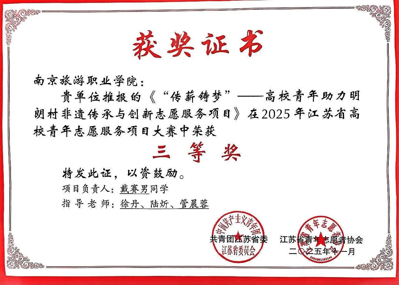 近日,2025年江苏省高校青年志愿服务项目大赛评选结果揭晓,我院推选的《农情水韵振兴路,产教融合志愿心——乡村研学产品开发创新志愿服务项目》与《传薪铸梦——高校青年助力明朗村非遗传承与创新志愿服务项目》双双荣获三等奖,展现了学院在志愿服务与产教融合、非遗传承领域的实践成果与育人成效。