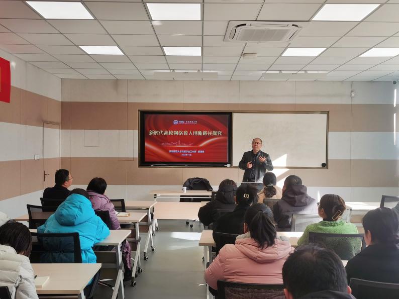 为进一步落实立德树人根本任务,提升学生工作队伍网络育人意识,11月30日,学生工作处举办辅导员素质能力提升工程专题培训,南京师范大学学工处副处长、江苏省高校网络思想政治工作中心副主任蔡炳锋受邀作题为“新时代高校网络育人创新路径探究”的报告。学院党委副书记朱琰、各二级学院党总支副书记、全体专兼职辅导员及社团指导老师参加了培训,培训由学生工作处处长姚强主持。