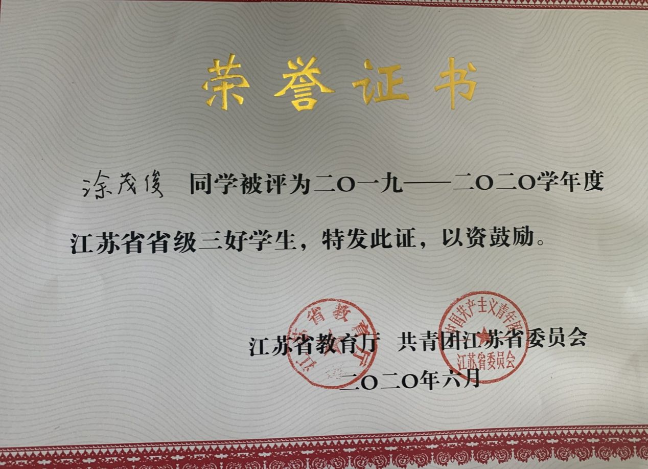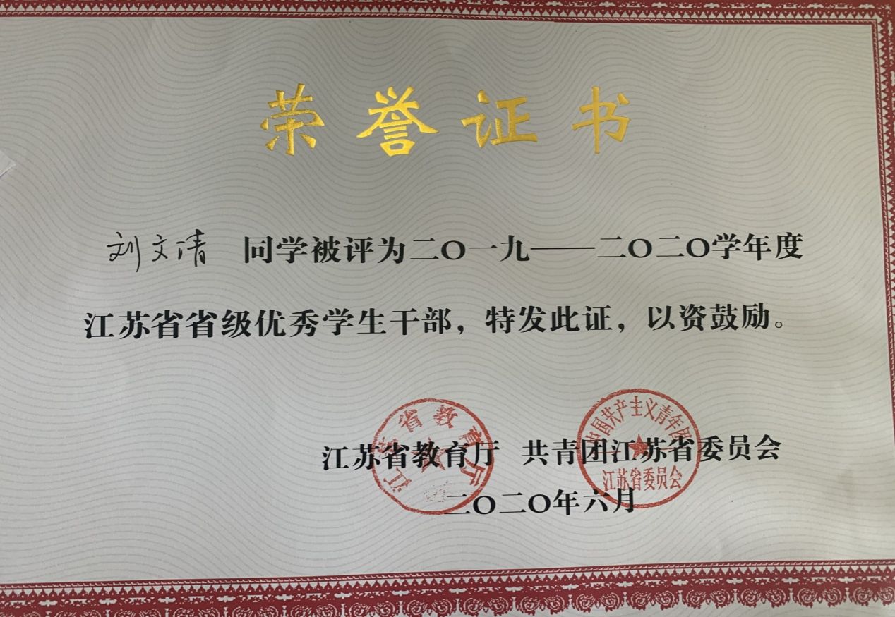 日前,江苏省教育厅、共青团江苏省委表彰了2019--2020学年度江苏省普通高校省级三好学生、优秀学生干部和先进班集体,我院涂茂俊等3名同学荣获省级三好学生,漆永昌等2名同学荣获省级优秀学生干部荣誉称号,183旅游日语(单招)班等2个班级荣获省级先进班集体荣誉称号。