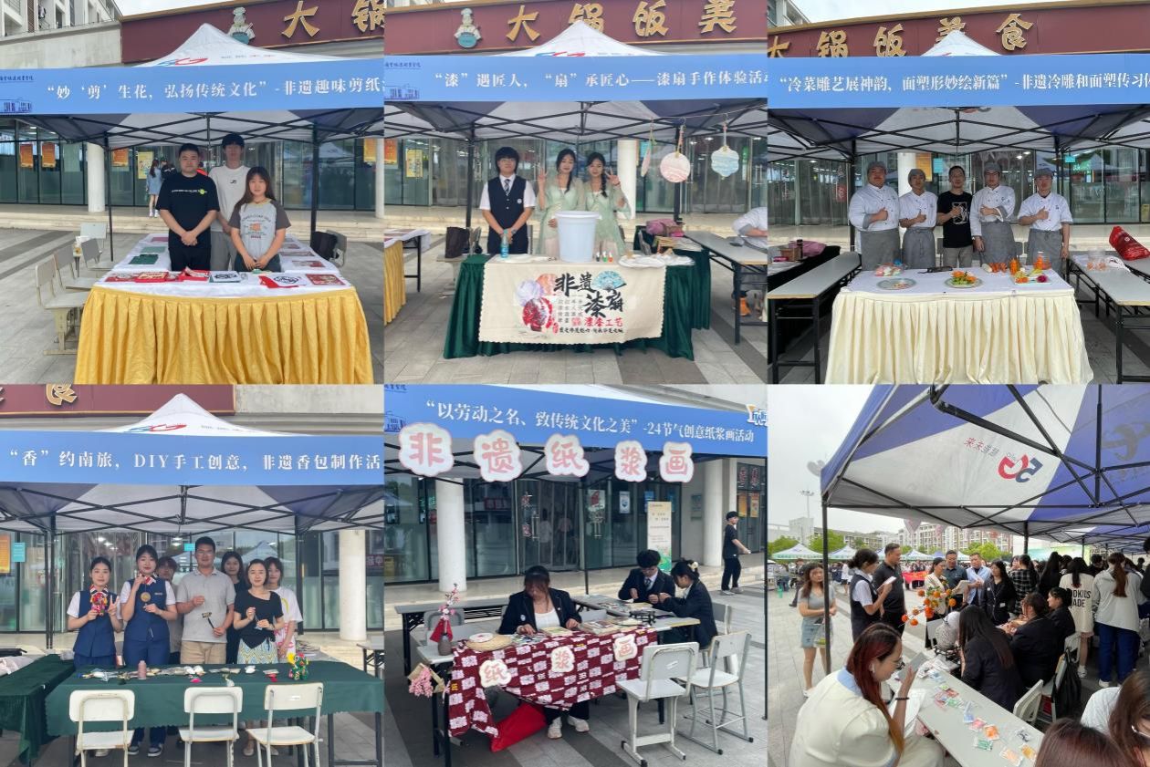 各二级学院结合自己的专业特色开展了不同的劳动传习活动。酒店管理学院开展了以“妙‘剪’生花 弘扬传统文化”为主题的非遗趣味剪纸课程,此次剪纸课程不仅丰富了学生们的课余生活,还锻炼了学生动手能力,培养了耐心、细致和专注的劳动品质;旅游管理学院开展了“‘漆’遇匠人 ‘扇’承匠心”为主题的漆扇手作体验课程,学生们不仅学习了漆扇的制作过程,更深刻体验了传统文化的魅力,提升了劳动技能和审美能力;烹饪与营养学院开展了“冷菜雕刻神韵 面塑形妙绘新篇”为主题雕刻课程,此次课程不仅让学生们在学习劳动技能的同时,深入体验了中华美食文化的魅力,更在雕刻的实践中锻炼了细致入微的观察力和精湛的手艺;人文艺术学院开展了“‘香’约南旅 DIY手工创意”非遗香包制作课程,课程的开展让学生们在动手实践中感受到了香包文化的魅力和劳动精神;旅游外语学院开展了“以劳动之名 致传统文化之美”-二十四节气创意纸浆画课程,通过纸浆画的制作,让学生们在动手实践中感受非遗文化的魅力,同时培养他们的环保意识和创新能力。