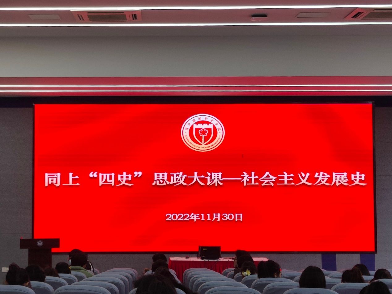 为了让“四史”学习教育真正走进学生心中,教育引导青年学子知史爱党、知史爱国,坚定矢志不渝听党话、跟党走的信心与信念,学工处精心组织开展了“四史”教育系列活动,于11月30日下午组织行政三联合党支部全体党员、学生代表在教学楼报告厅认真观看、学习“同上‘四史’思政大课”活动的第四讲——“社会主义发展史”视频。