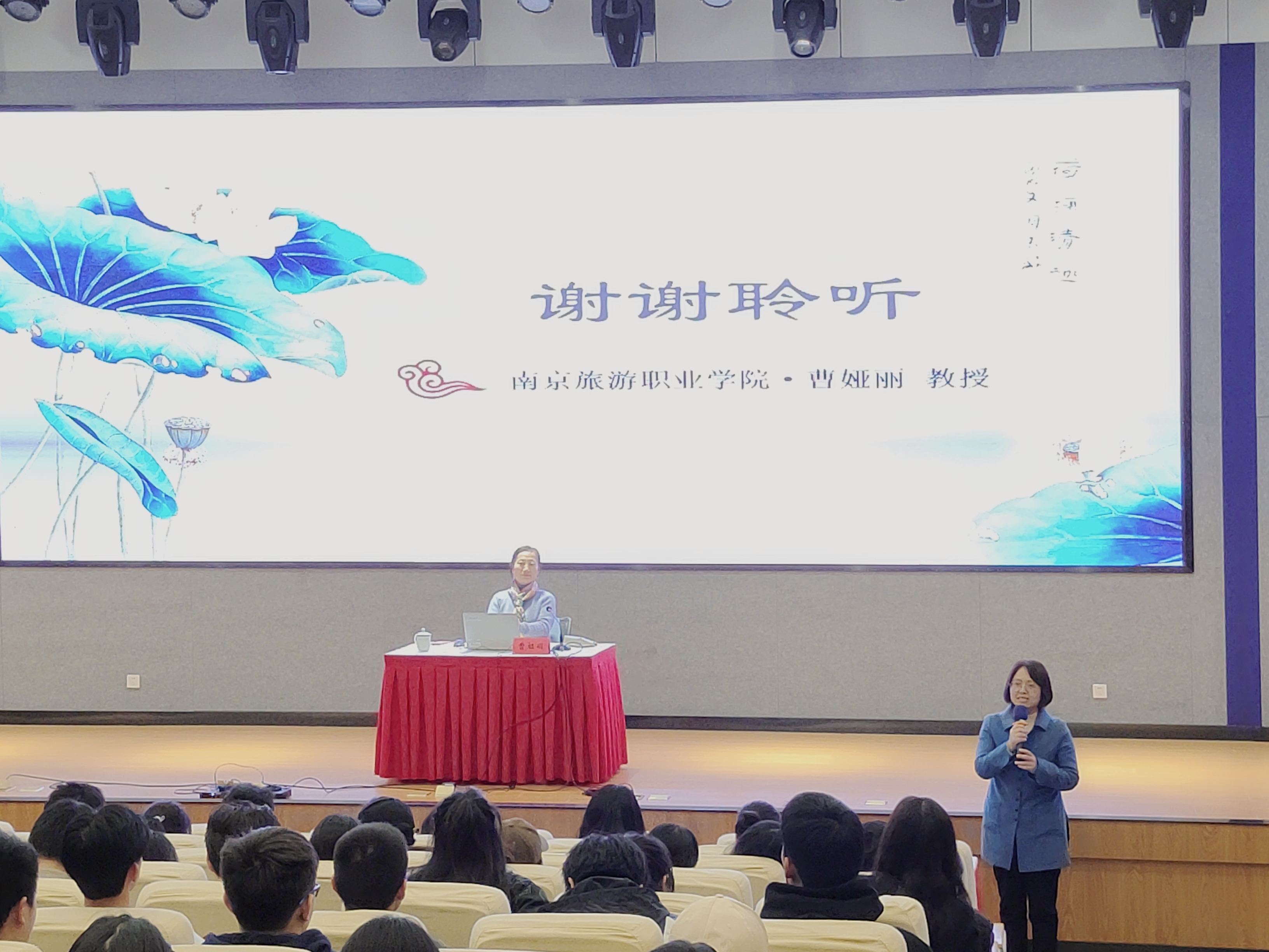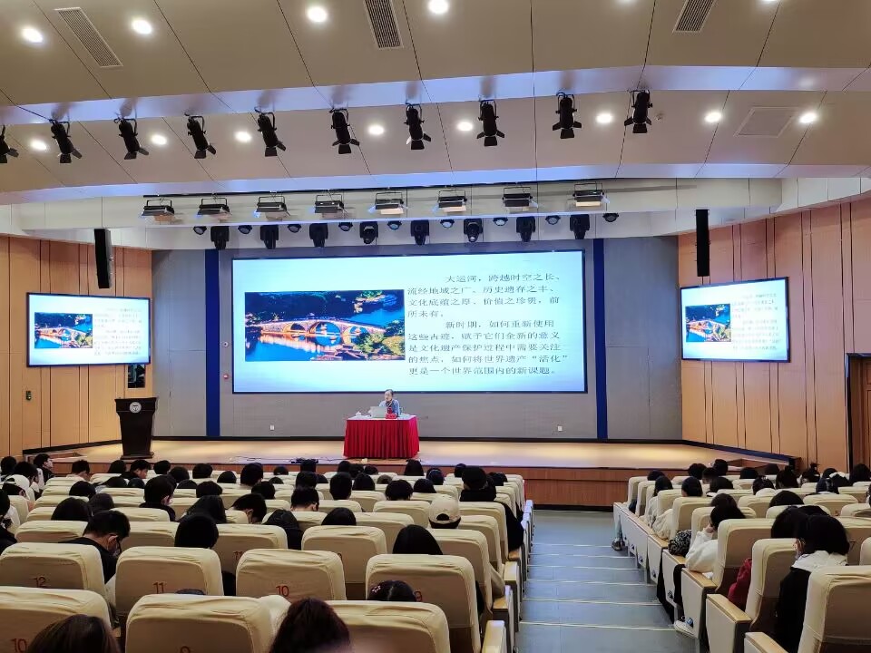 曹教授首先阐述了非遗的概念及分类,接着从大运河的历史、大运河的文化、江苏段艺术遗产、大运河的价值四个方面深入浅出、图文并茂地给同学们做了详细的讲解。她重点介绍了苏州昆曲、徐州梆子戏、江苏傩戏等大运河的艺术遗产,使同学们对大运河文化有了更深入的了解。讲座结束之后,狄苏进行了总结。