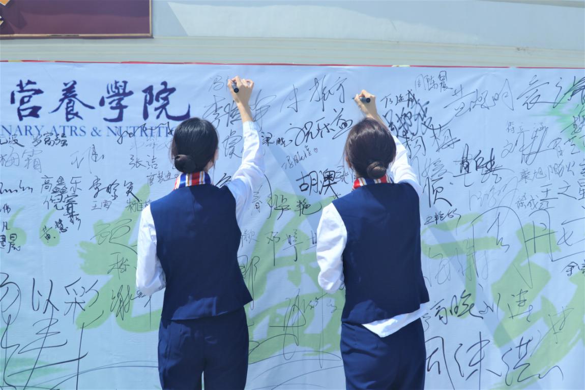 在活动现场,老师们和同学们纷纷在展板上留下自己的签名,承诺自觉做勤俭节约的表率,从自身做起、从小事做起,养成节约粮食的良好习惯。