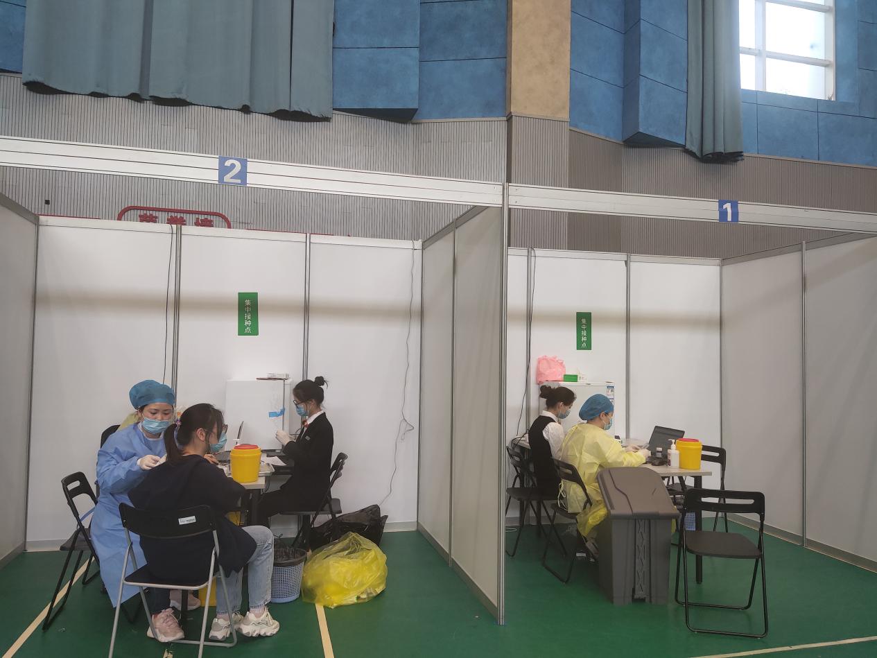 志愿者们7:30准时到达接种现场,分成现场引导员、医护人员助理两组,快速到达各自岗位并开展工作。通过系统的岗前培训,志愿者们掌握了有关疫苗接种的相关知识,在保障接种工作有序进行的同时也对前来接种师生们提供问询服务,指引大家前往登记区进行健康问询、登记疫苗、电子审核签到,留观等。医护人员助理,协助社区医护人员开展医疗活动,如整理医疗器械和登记接种信息等,极大程度上提高了接种速度。