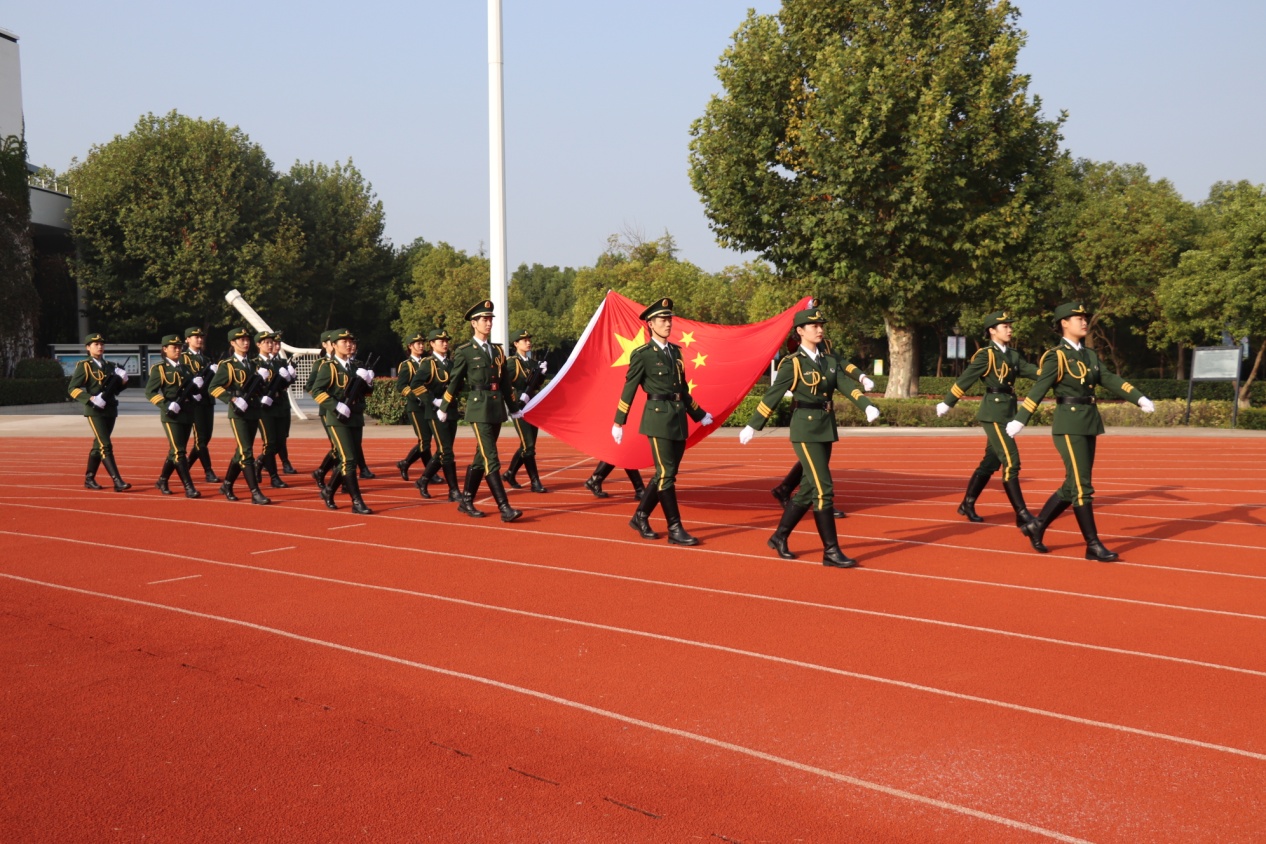国旗护卫队气宇轩昂,英姿勃发,目光坚定,迈着整齐有力的步伐护送国旗走向升旗台。