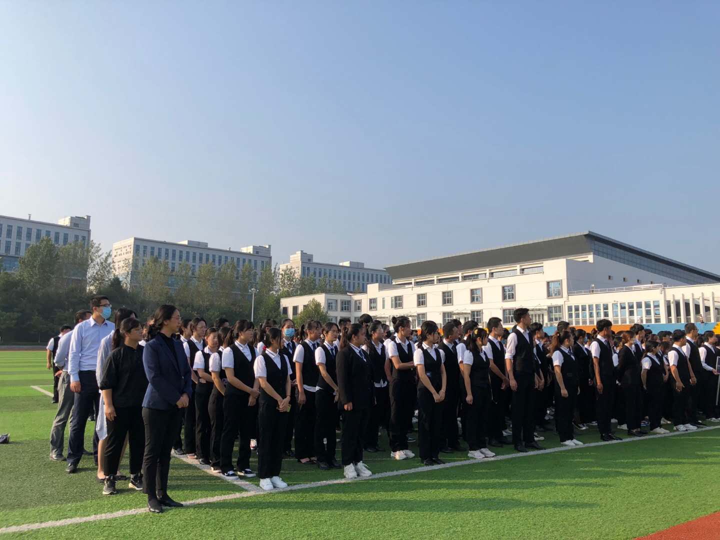 在雄浑激昂的国歌声中,五星红旗冉冉升起,全体师生面向国旗,奏唱国歌,行注目礼。