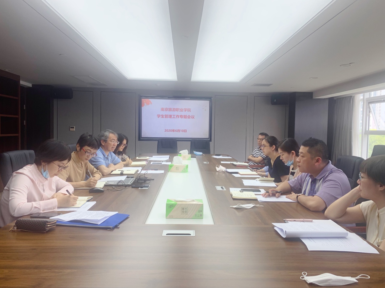 会上,陈海艳从学生思想政治教育、日常教育管理、宿舍管理、学生资助、征兵工作开展、创新创业项目申报以及辅导员队伍建设等方面就本学期学生工作进行了汇报,重点就学生复学复课后的学生管理现状进行了分析,结合疫情防控做好学生各项管理工作,注重思想引领,弘扬抗疫精神,强化学生爱国主义教育。刘爱春就开学至今学生心理健康教育工作进行了汇报,从心理咨询与危机干预、全面心理排查、重点人群关注以及丰富心理健康教育形式等方面介绍了目前开展的工作,强调学生工作要更加重视学生心理健康,做好心理排查,密切关注重点人群。根据《南京旅游职业学院2019-2020学年第二学期学生离校及学期末学生教育管理工作方案》,陈海艳就学生学生离校及学期末各项学生工作进行了布置,明确工作要求,守牢安全底线,让学生教育管理落实落细,确保所有学生积极复习迎考,安全文明离校。