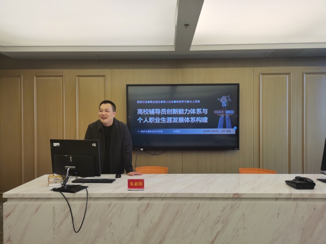 本次讲座特邀南京交通职业技术学院教师发展研究所所长朱素阳作为主讲嘉宾,朱素阳所长结合自身从事党总支副书记、人事处处长以及先后指导学生荣获各级各类创新创业奖项20余项的工作经验,为辅导员们详细解读了高校辅导员的职责定位、能力塑造与时代重任等方面的要求,分享了个人职业生涯发展的经历与体会,鼓励老师们以人为本,通过开展理论学习、调查研究、思政实践等将育人工作落到实处。他向老师们提出建议:要提前规划、善于学习,要勇于尝试、开拓边界,要胆大心细、珍惜时光,不断改革创新工作思路与工作方法,做好本职工作,谋划个人未来。