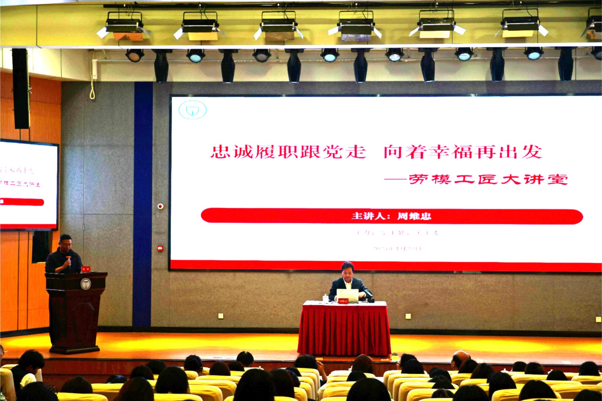 4月23日下午,学生工作处联合学院关工委于在图书馆报告厅举办开展“劳模工匠进校园”活动。活动邀请了党的二十大代表、全国劳动模范、全国道德模范周维忠作题为《忠诚履职跟党走,向着幸福再出发》的专题报告。学院关心下一代工作委员会驻会秘书长谢晓美、学生工作处副处长杜文文、退休教师代表及300余名学生到现场聆听。讲座由学生工作处处长姚强主持。