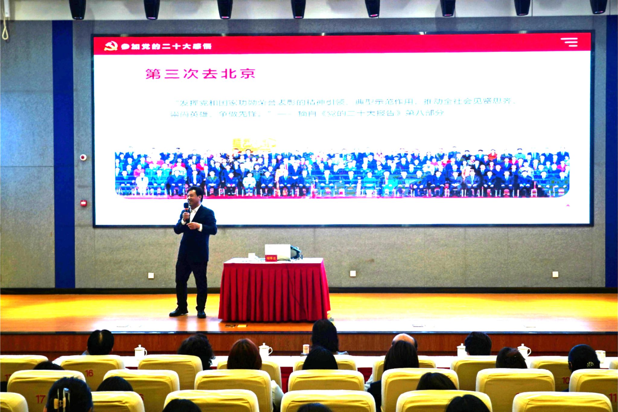 周维忠首先向同学们分享了自己的成长经历与心路历程。他用纯朴真挚的话语讲述了一个普通农村劳动人民是如何一步步成为点亮万千灯火的“光明使者”。随后,他还围绕“自豪”、“激动”、“紧张”三个关键词生动讲述了自己参加党的二十大感受,并鼓励同学们要坚定不移听党话、跟党走,立志做有理想敢担当能吃苦的新时代好青年。