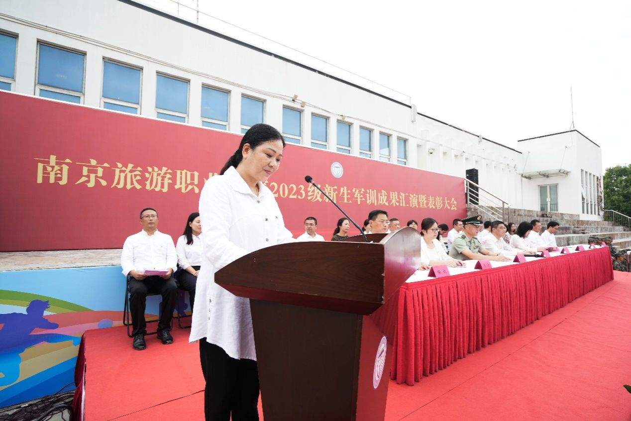 操阳院长在会上做了题为“胸怀凌云志,不负少年时”的主旨讲话。她向大力支持我院军训工作的武警江苏总队机动支队表示感谢,对连日来不辞辛苦、无私付出的教官们致以崇高的敬意和衷心的感谢!对圆满完成军训任务的全体新生表示热烈的祝贺!她表示紧张充实的军训生活就要结束了,修德、善美、勤学、敏行的大学学习和生活即将拉开帷幕,希望同学们把军训过程中练就的优良作风以及顽强拼搏的精神永远保持下去,怀揣着成为优秀文旅人的梦想和希望,珍惜时光,在学习上刻苦钻研、在知识的海洋里徜徉,勇于探索、不断夯实自己的专业知识和技能;在生活中敢于吃苦,乐观向上、团结拼搏、永不言败,不断提升自己的职业道德和综合素养,为成为优秀的文旅接班人积累能量。
