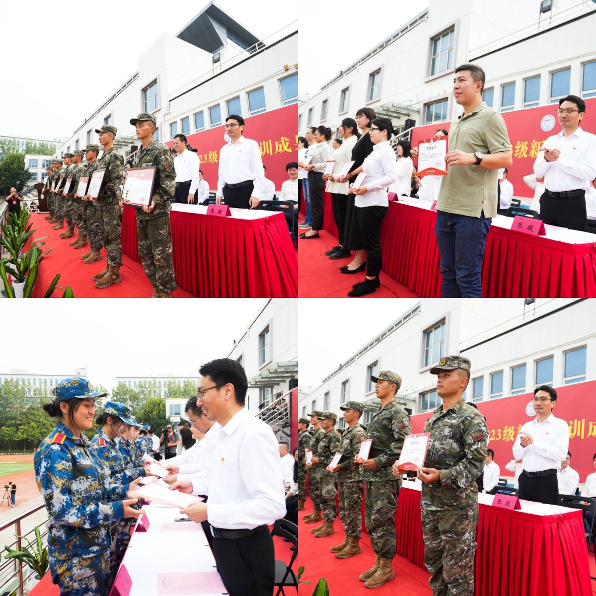朱琰副书记宣读《关于表彰2023级新生军训“先进集体”和“先进个人”的决定》,学院和部队领导为获得“军训先进集体”“军训优秀教官”“军训先进工作者”和“军训优秀学员”代表颁奖。