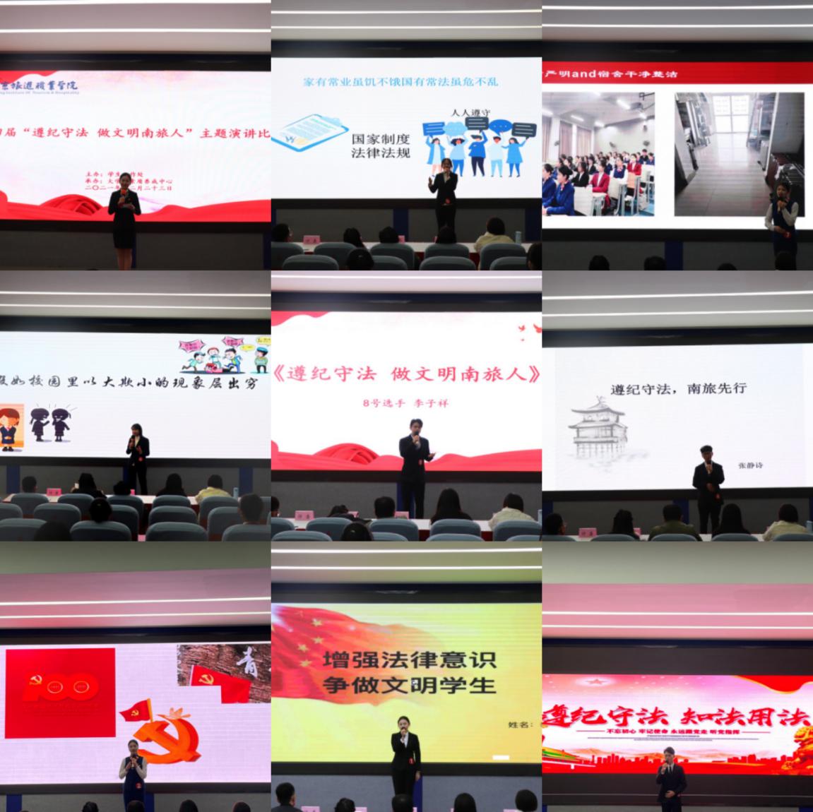 为进一步加强大学生思想政治教育工作,强化法治意识和纪律观念,提升文明修养,全面提升学生的综合素质,营造良好的学习氛围,创建文明和谐的校园环境。12月23日17:00,第四届“遵纪守法,做文明南旅人”主题演讲比赛在2号楼报告厅举行。本次比赛邀请嘉宾有学工处副处长姚强,团委副书记沙成金。担任本次比赛的评委有酒店管理学院老师王璐,旅游管理学院老师余伟、人文艺术学院老师陆炘、烹饪与营养学院老师段牡钰、旅游外语学院老师史迁担任比赛评委。