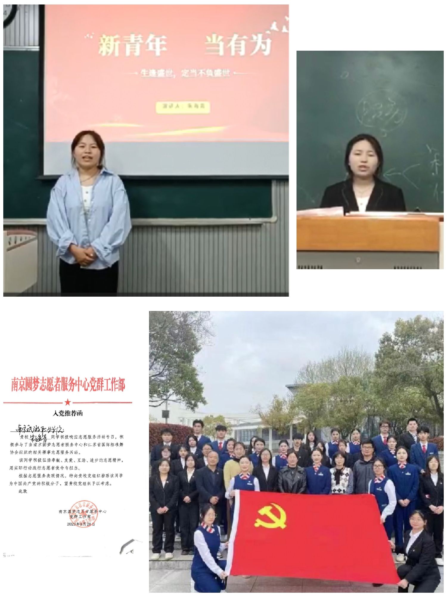 她在追光,与光同行,因为深受中国共产党思想之光的影响,自大一开学之始朱海青就坚定地提交了入党申请书,从最初被评为优秀共青团员到层层选拔为中共预备党员,她深知自己肩负的责任和使命,平日里主动加强理论学习,深入学习贯彻党的二十大精神。从在主题班会上发言到参加“新青年,当有为”演讲比赛,全力将自己的青春奋斗融入党和人民的事业,积极参加支部的党日活动,树立党员风范;除此之外,她注册成为南京圆梦公益组织的一名志愿者,参加该党群中心举办的多场活动,例如在入党前,她参与走访慰问鼓楼区老人,以细心周到的服务受到负责人高度表扬,并收到了珍贵的入党推荐函。心中有光,坚定信念,足下才有力!